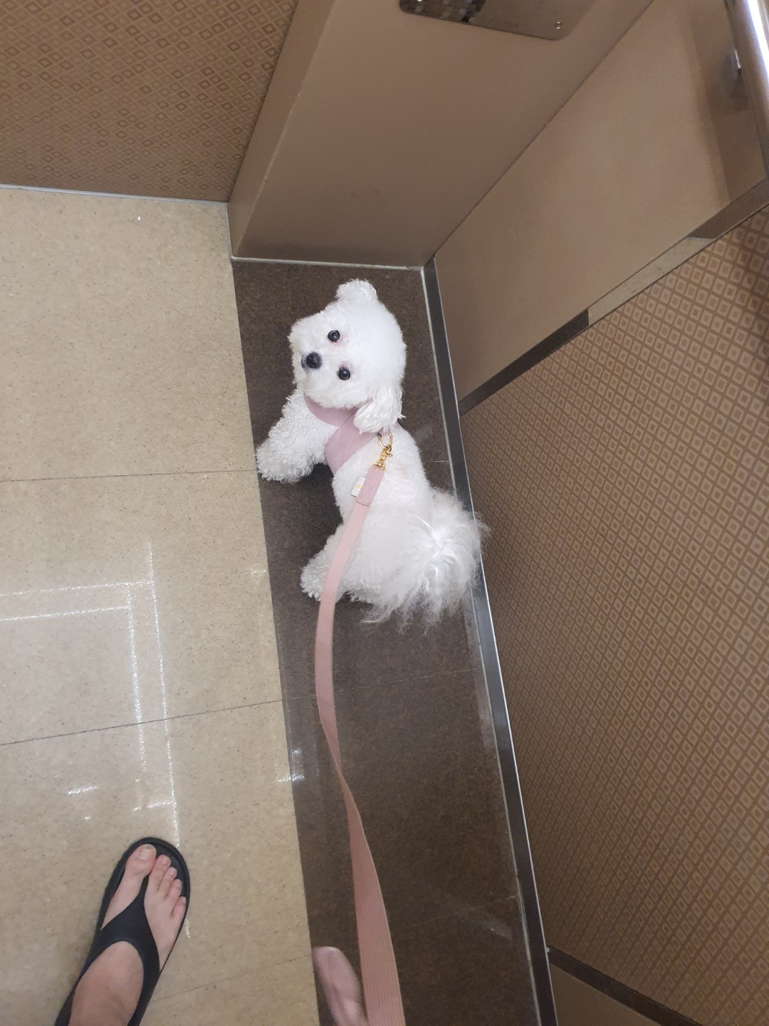 Q. 산책 중에 겪은 가장 재미있는 일은 무엇인가요? 강아지가 보도블럭 라인?거기만 따라 걸어요