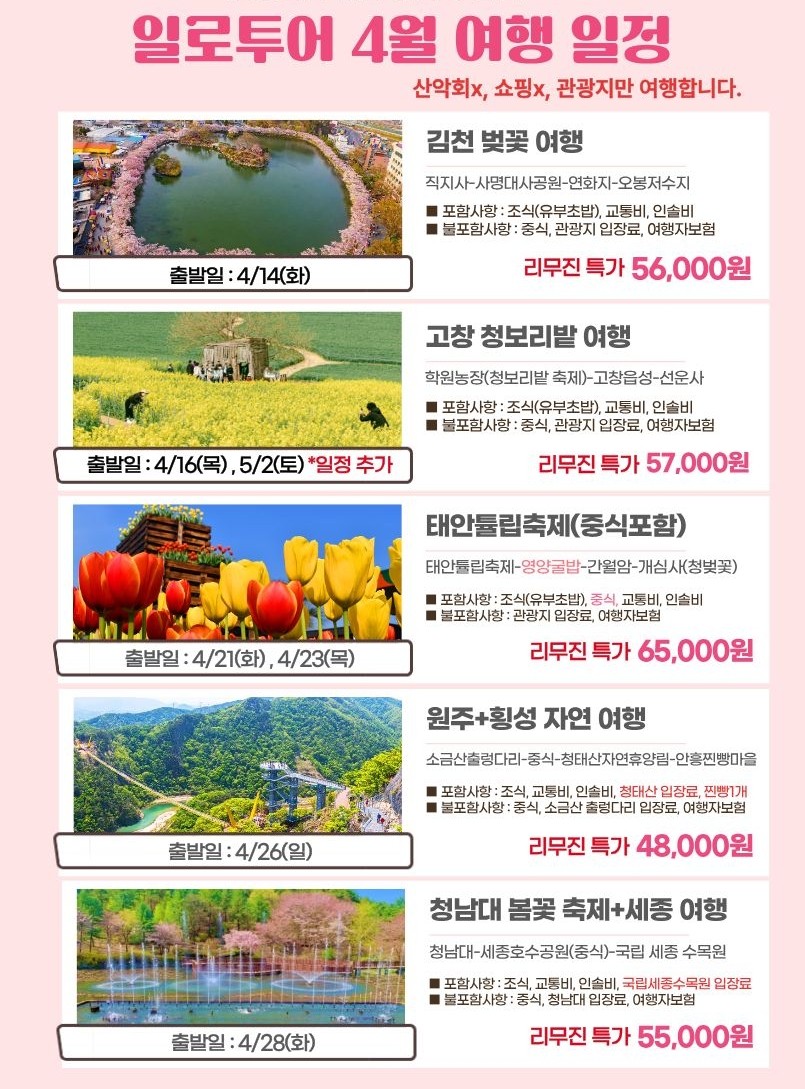 4월~5월 여행 일정표 안내(예약 마감제외)