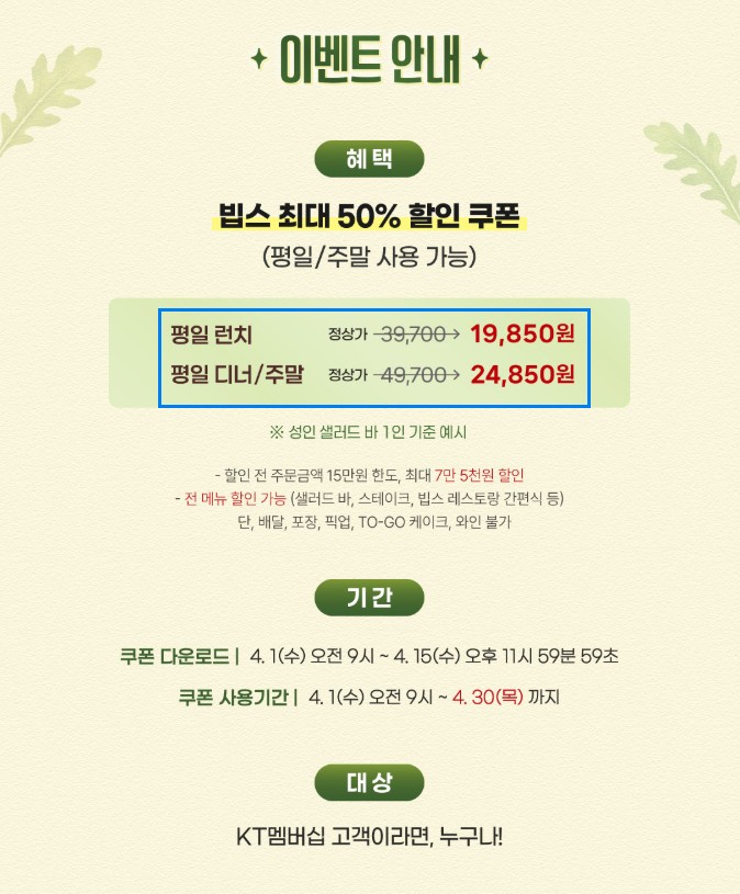 Kt 고객 빕스 최대 50% 할인