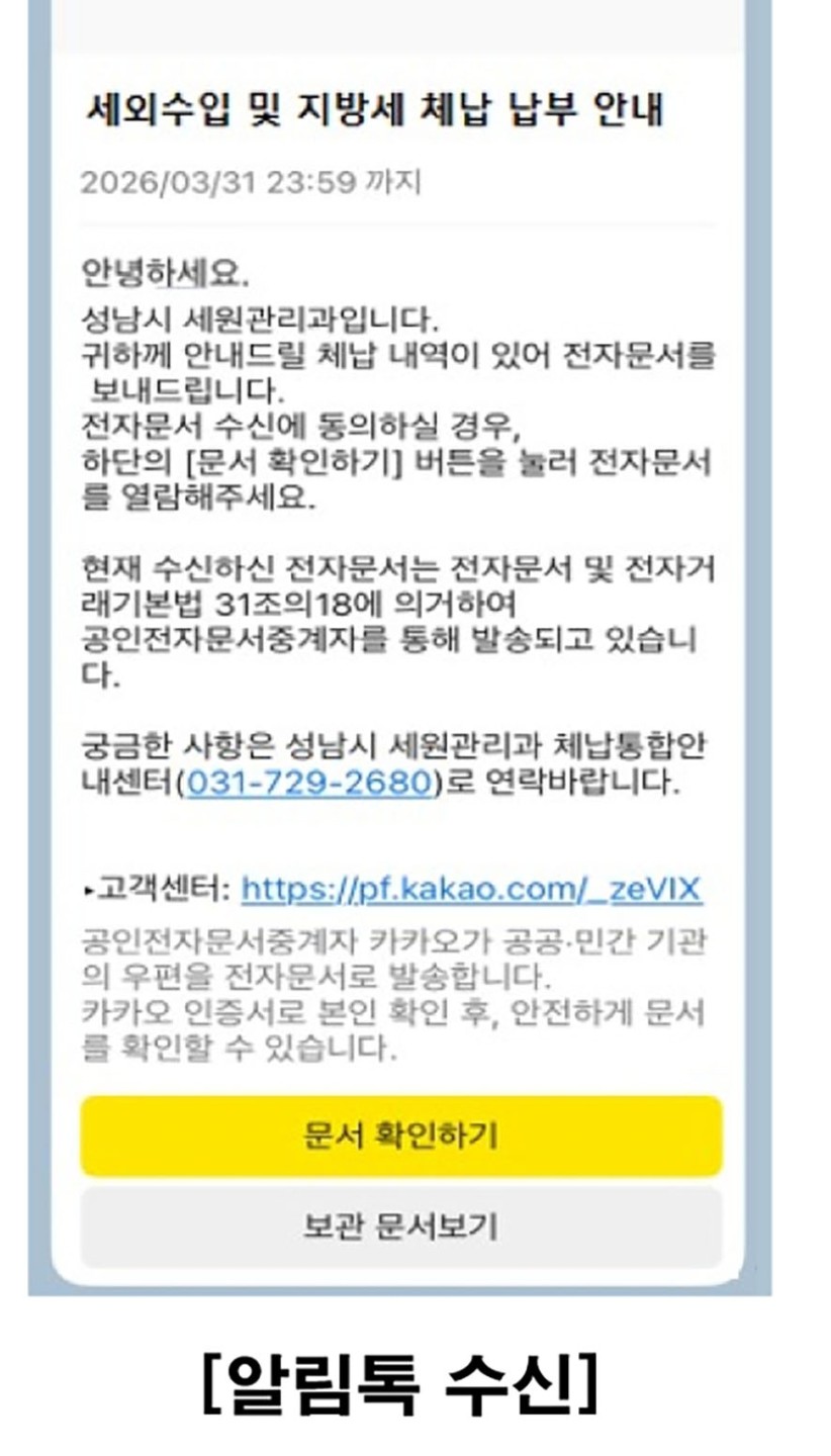 성남시에서 세금 관련 이제 카톡으로 안내해준다고 하네요