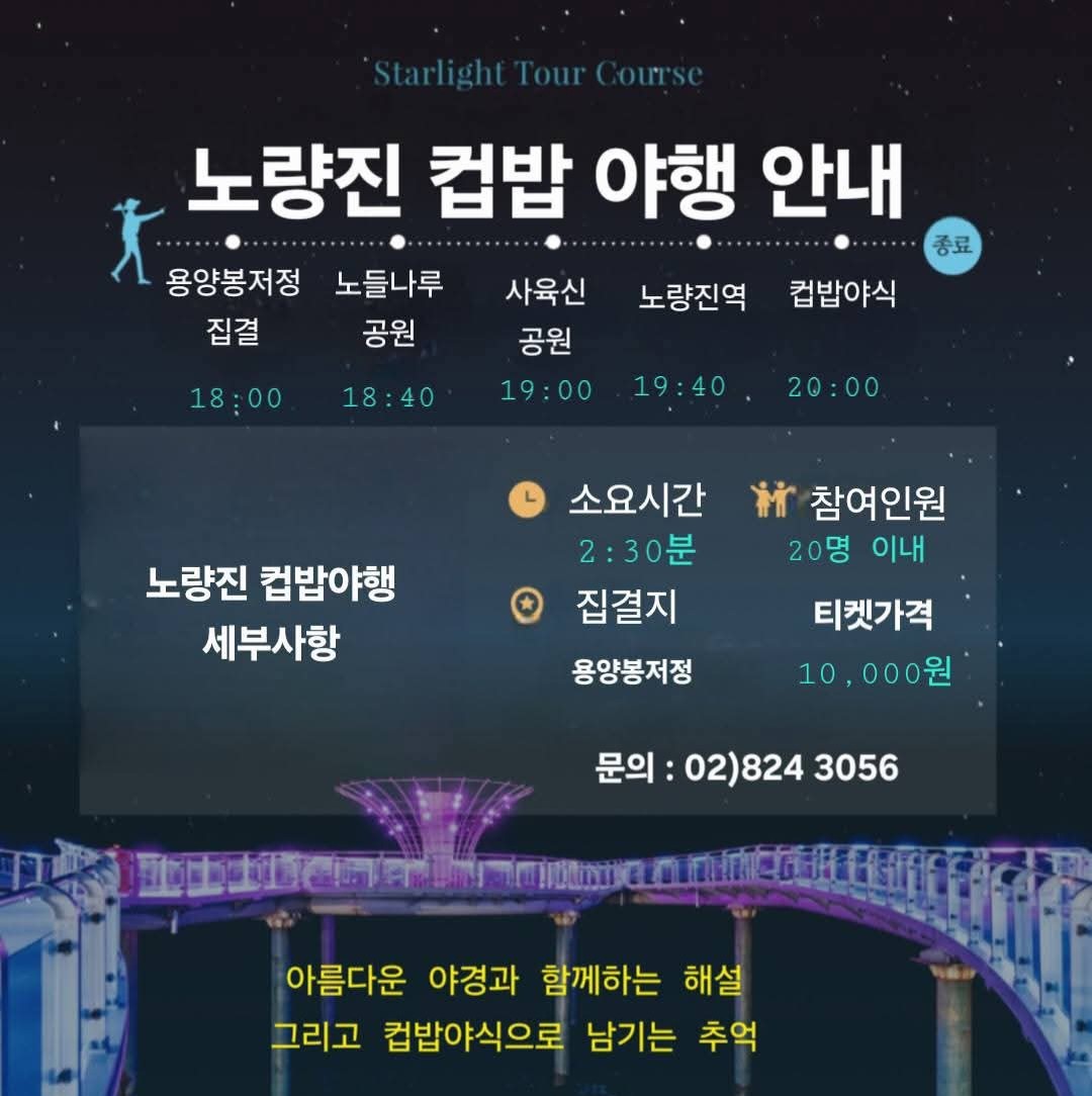 용양봉저정 - 노들나루공원 - 사육신공원 - 전망대 서울야경 감상 - 노량진 컵밥야식 후 해산