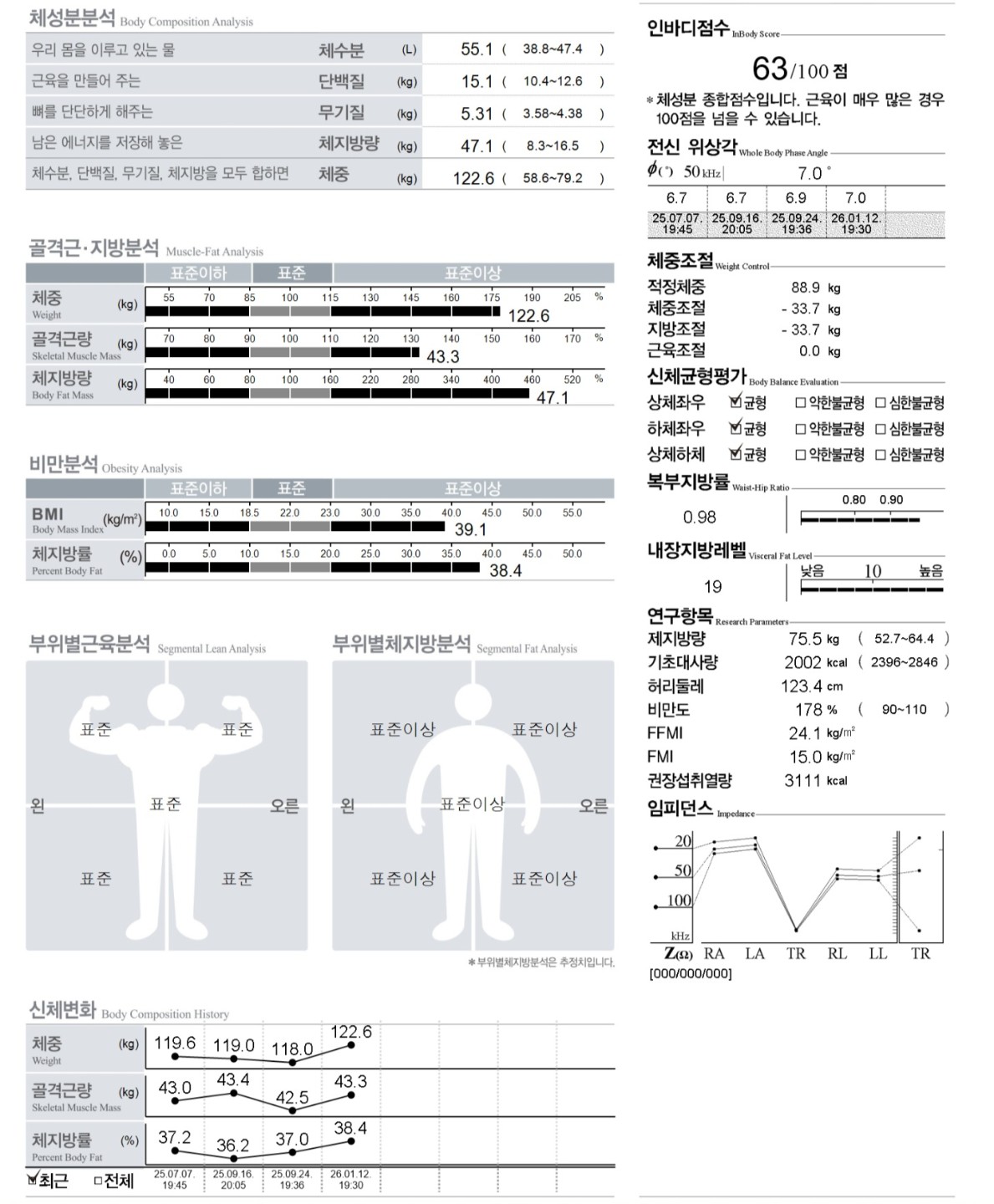 음..제가 시작하기전 몸무게보다 12-14kg 더 높으신 상태신데,, 식단조정하시고, 유산소운동 매일 넣으시고,, 절대 런닝금지입니다 무릎아작나요. 40분-1시간정도 하루에 1-2번 매일하시면될거같습니다. 시간여유있다고하시면 하루 2번 매일 50-60분 걷기 유산소에,, 근력운동은 자극주는정도로만할거같습니다.(유산소는 뛰고 엄청천천히걷는거보다 빠르게 꾸준하게 걷는게 더 좋습니다. 지금몸무게정도시면 20분정도 지나면 땀나기시작하실거에요) 저도 런닝은 83kg이하로 떨어지면 뛸생각이고 지금 무릎염증때문에 8일째쉬고 있긴한데, 108-110kg->90kg까지오는데는 5주정도걸렸어요. 오히려 천천히뺄려고 계속 단백질추가했고요. 식단 좀만 관리하시고, 지금무게에서 유산소꾸준히 걷기운동으로만 하셔도 쭉쭉빠집니다. 그리고 트레드밀이 속도6이면 약간 속이는 트레드밀일 확률이 높을거같긴한데.. 조금이라도 뛰실거같으면, 지금 트레드밀이6이면 5.7정도로 조정해시는것도 좋은 방법입니다. 이정도 체지방양이면,, 필요하시다고 하시면 제가 하는 식단드릴 수도 있어요..!!(장기간하기엔 안좋지만 3달정도하기엔 괜찮습니다) 몇kg목표신지몰라서,,전 65-70정도로 만들거라서 5월전까지,, 저는 추천이 목표몸무게에따라 지금 골격근량 자극으로 유지정도로만하시고 유산소하시는것도 추천드립니다. 30kg감량하시고 골격근량 늘리시는것도 충분하실거라서,, 전 사람이 자신감이 어느정도생기고, 운동하면 더 열심히 할 수 있다인거같아서. 착한사람이다님이 말한 허약하게 설계된 인체가아니라 관절은 강화가 거의 불가능하기에 무리해서 뛰면 그냥 나중에 연골 다 나가서 나중에 고생하세요…