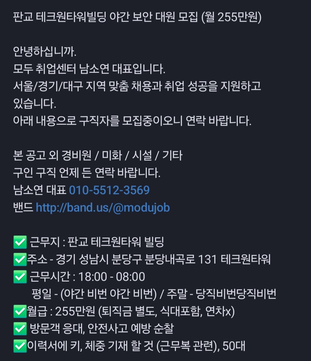 판교 테크원타워 경비원모집(255만원)
