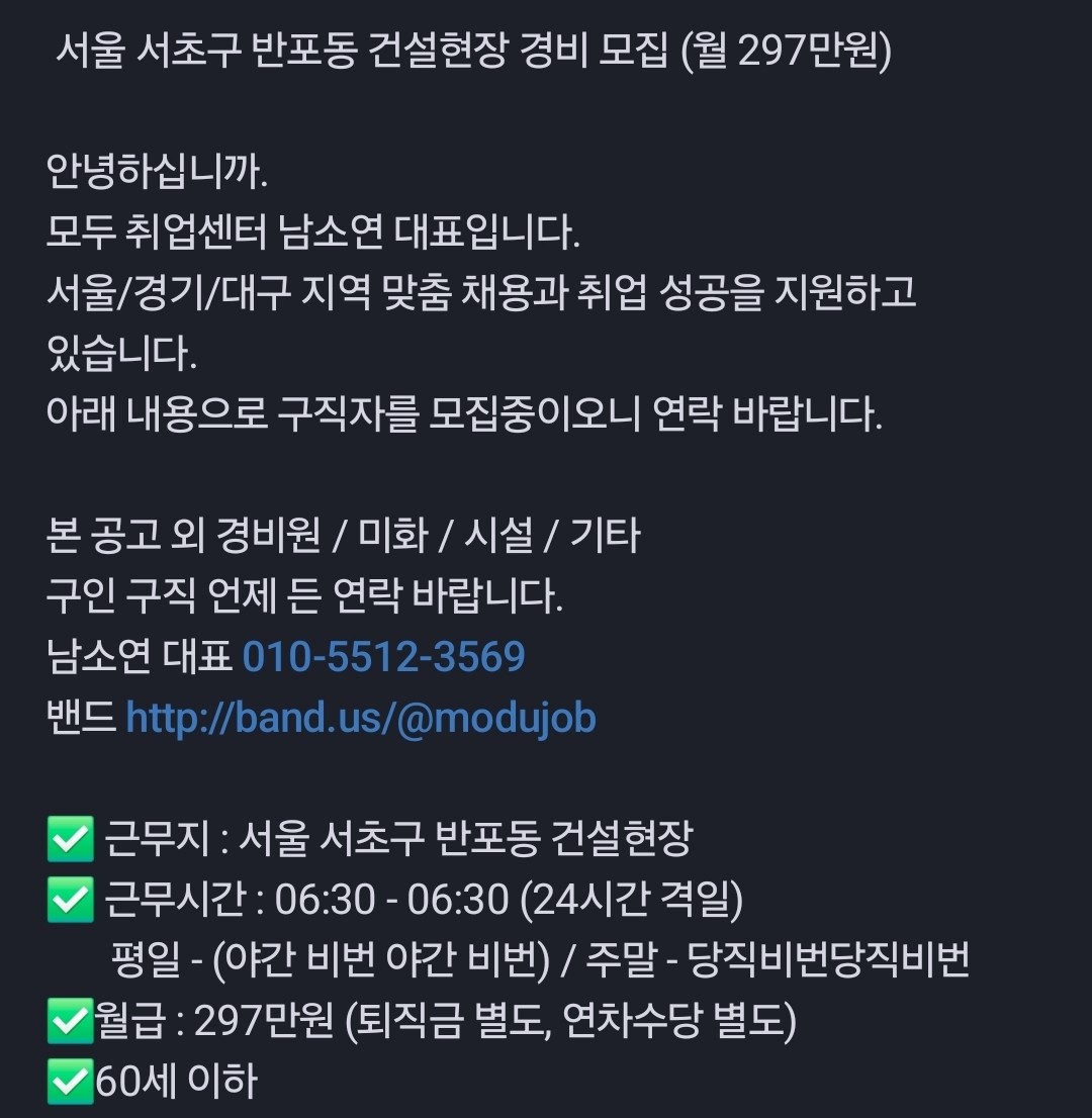 안녕하십니까. 모두 취업센터 입니다. 서울/경기 지역 맞춤 채용과 취업 성공을 지원하고 있습니다. 아래 내용으로 구직자를 모집중이오니 연락 바랍니다. 경비원 / 미화 / 시설 / 기타 구인 구직 언제 든 연락 바랍니다. 박현선 부장 010-8161-3569 밴드 http://band.us/@modujob #경비#미화#시설#신호수#안전감시단 #취업#소개