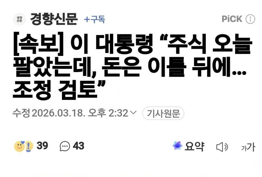 속보-이 대통령,"주식 오늘 팔았는데,돈은 이틀 뒤에..조정 검토" 기사