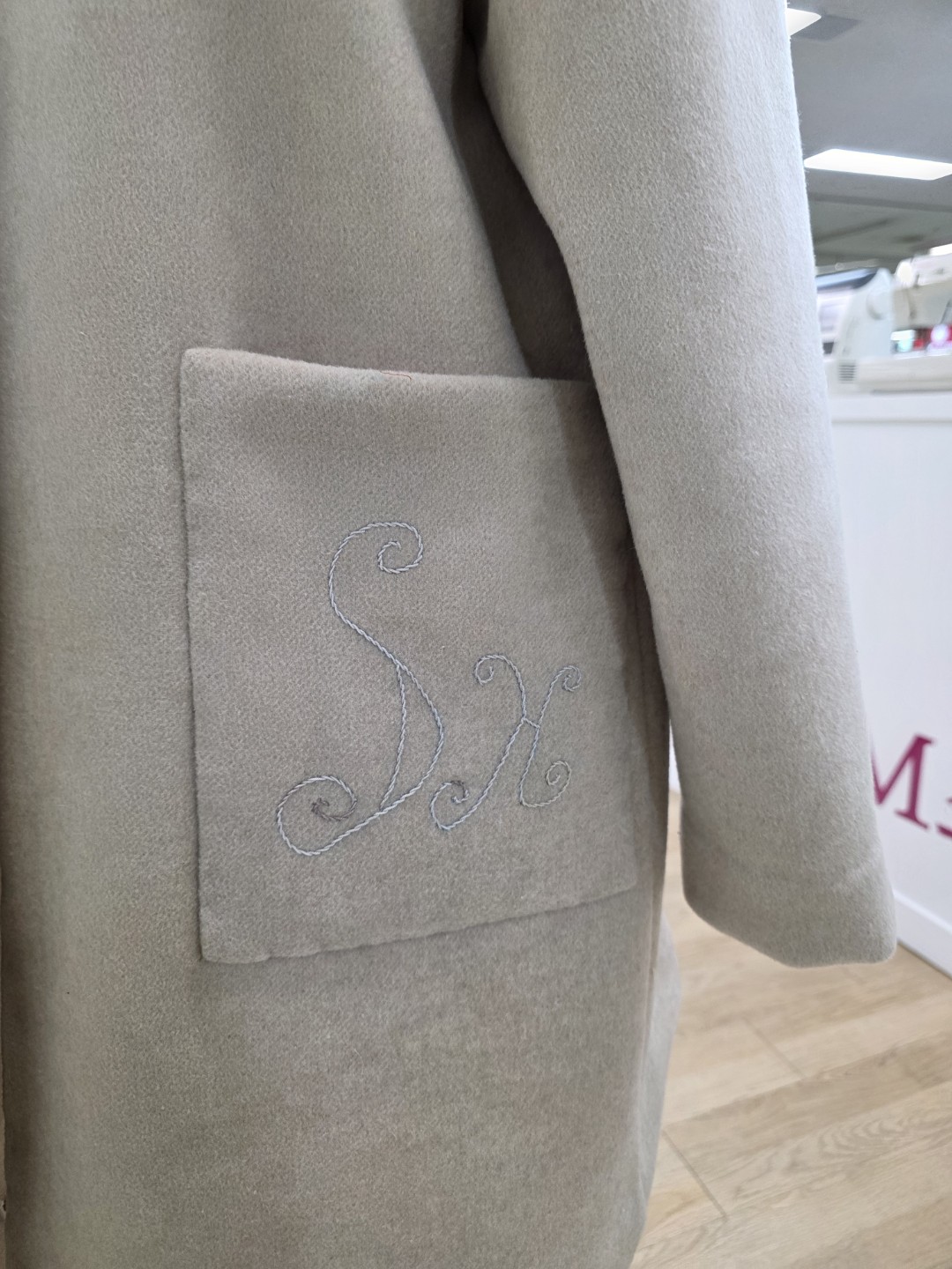 주머니 포인트엔 이뿌게 자수실로 모양내고 이니셜도 새기고~