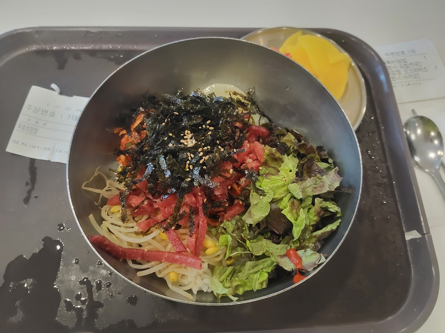 키오스크에서 베스트 메뉴인 육회 비빔밥과 닭강정 오므라이스를 주문하고 안에 들어가서 자리를 잡고 셀프로 밑반찬과 수저를 세팅 하고 잠시 기다리니까 김밥천국과 아지오 코너에 주문 번호가 뜨면 갖고 와서 먹었어요.