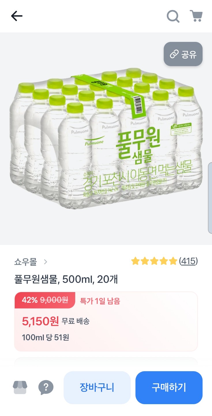 풀무원샘물 500ml, 20개 5150원