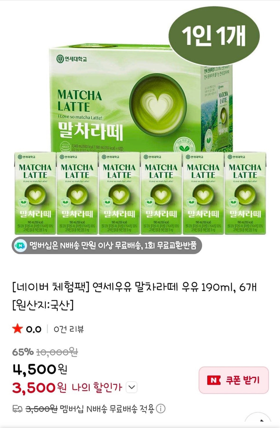 연세우유 말차라떼 190ml 6개 3,500원