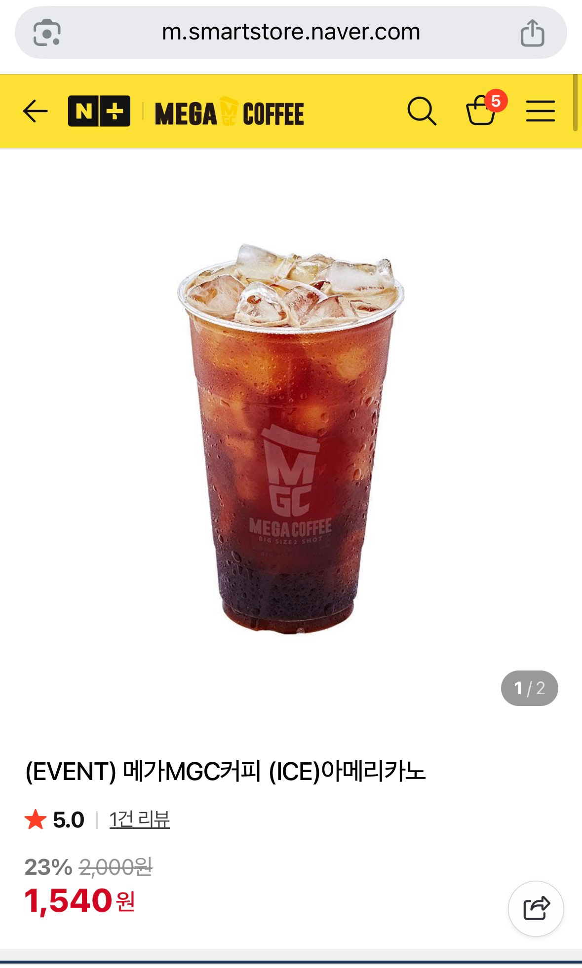 메가커피 아이스아메리카노 23%할인 1,540원