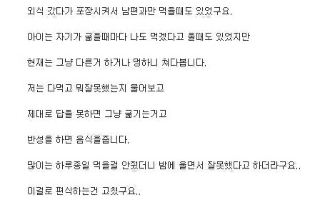 부모마다 아이훈육 방식은 다르다고 생각합니다.. 본인들과 훈육방법이 다르다고 방치네..아동학대네..하시는 분들도 계시죠.. 물론 6살아이를 말 안 듣는다고 밥을 굶기는건 이해가 가지 않는 훈육이긴 하나 . 그 부모만의 훈육방법이라 생각해야 하지 않을까요? 그러나 잘못된 훈육이긴 합니다.