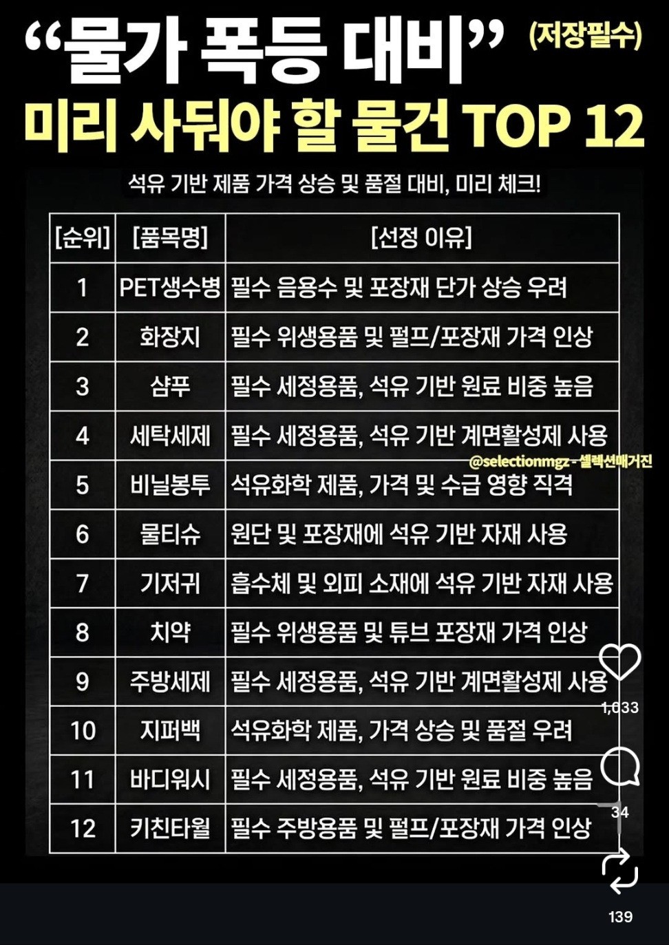 물가 폭등 대비 미리 사둬야 하는 물건 TOP 12