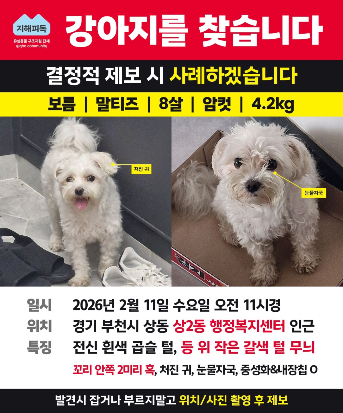 부천 유실견 보름이를 찾습니다.