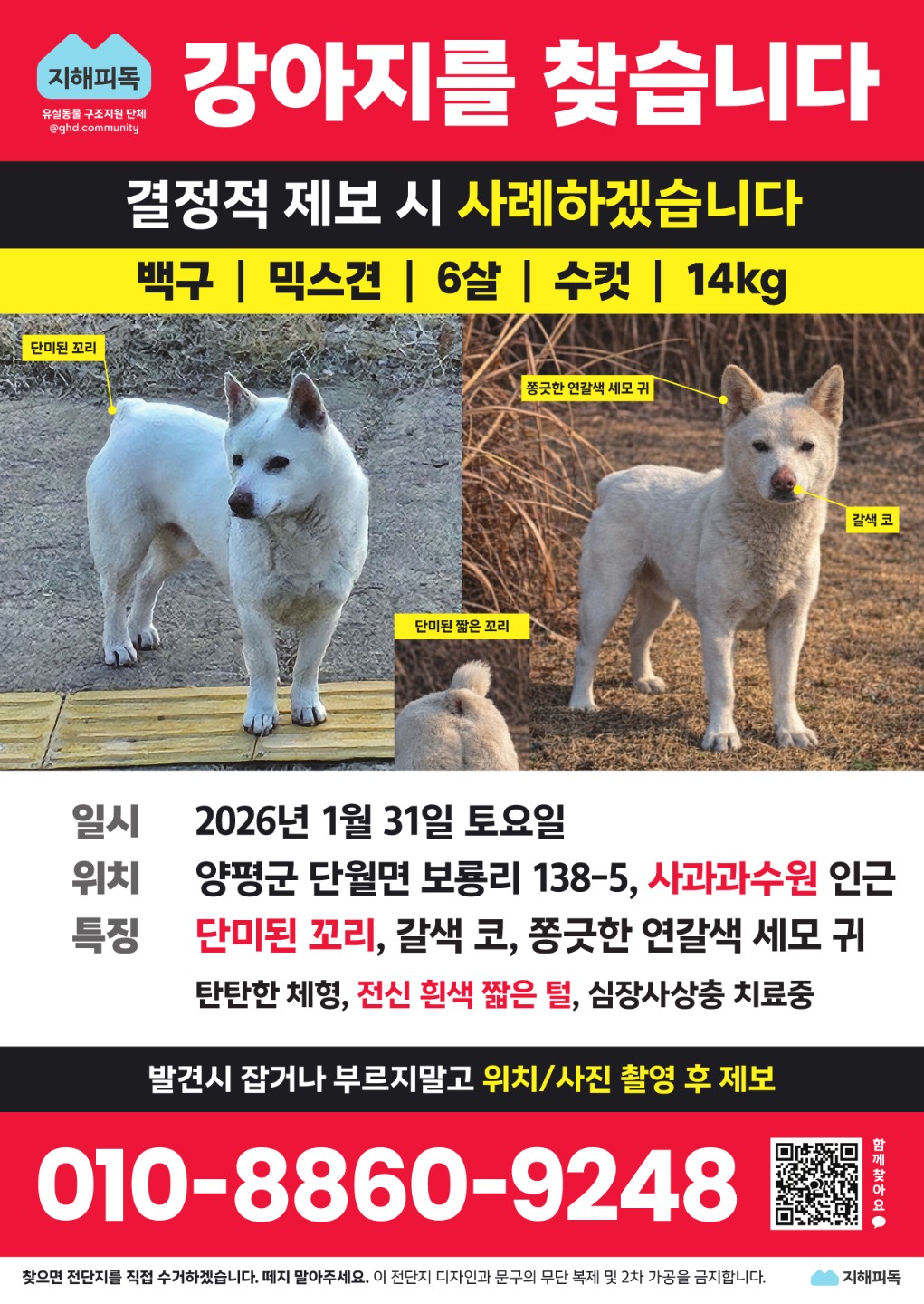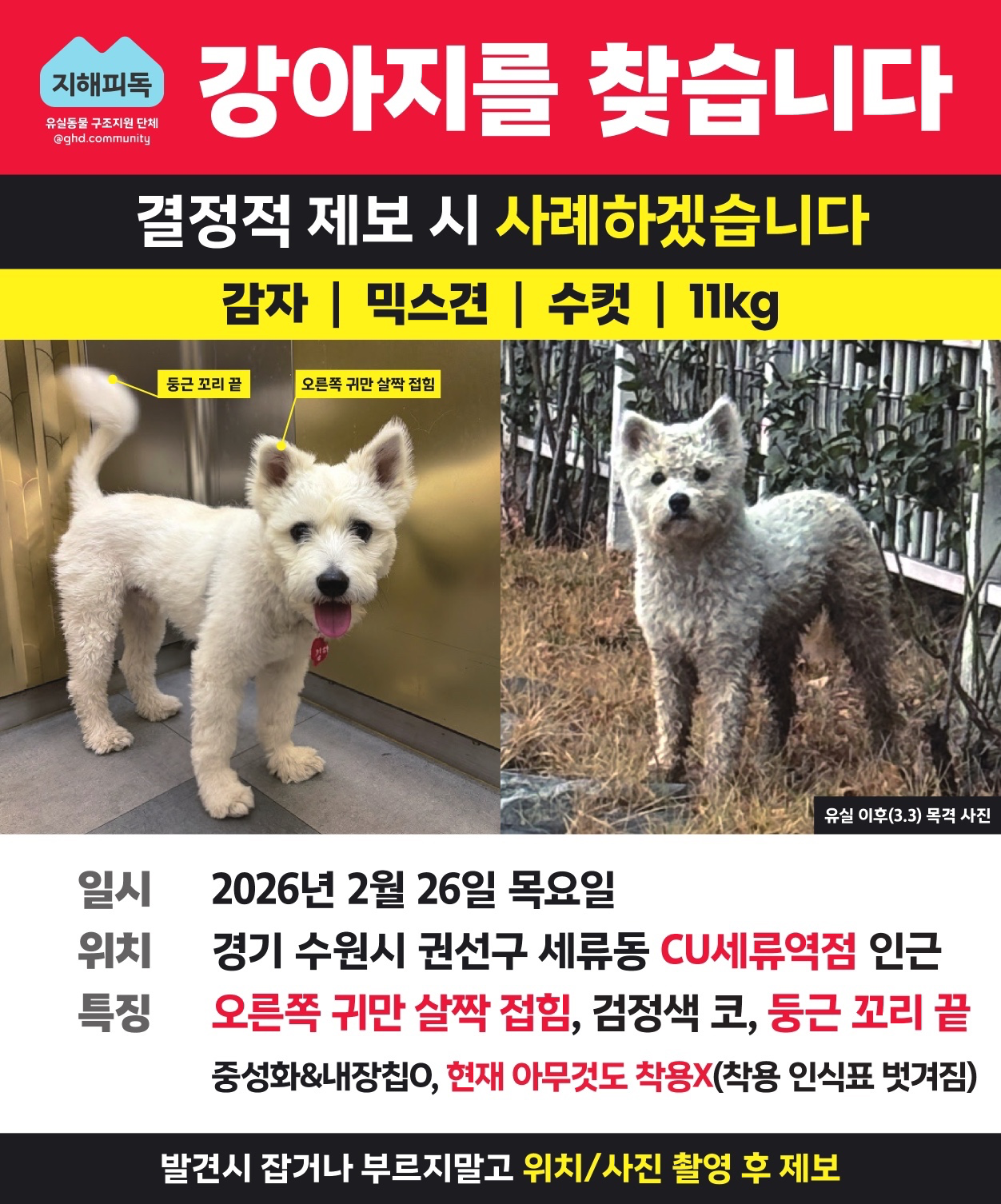 동탄신리천 유기견-꼬리단미 백구 수컷 구조자가 찾아요