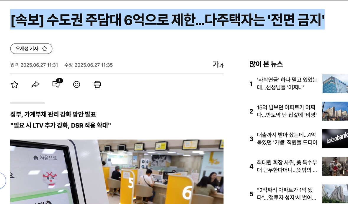🚨[속보] 수도권 주담대 6억으로 제한…다주택자는 '전면 금지'