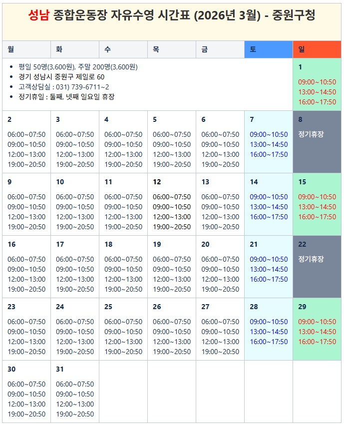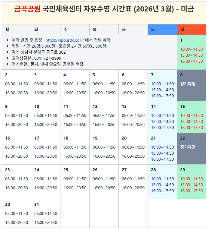 일일 자유수영 시간표 (탄천,성남,판교,황새울,평생,금곡) | 당근 카페