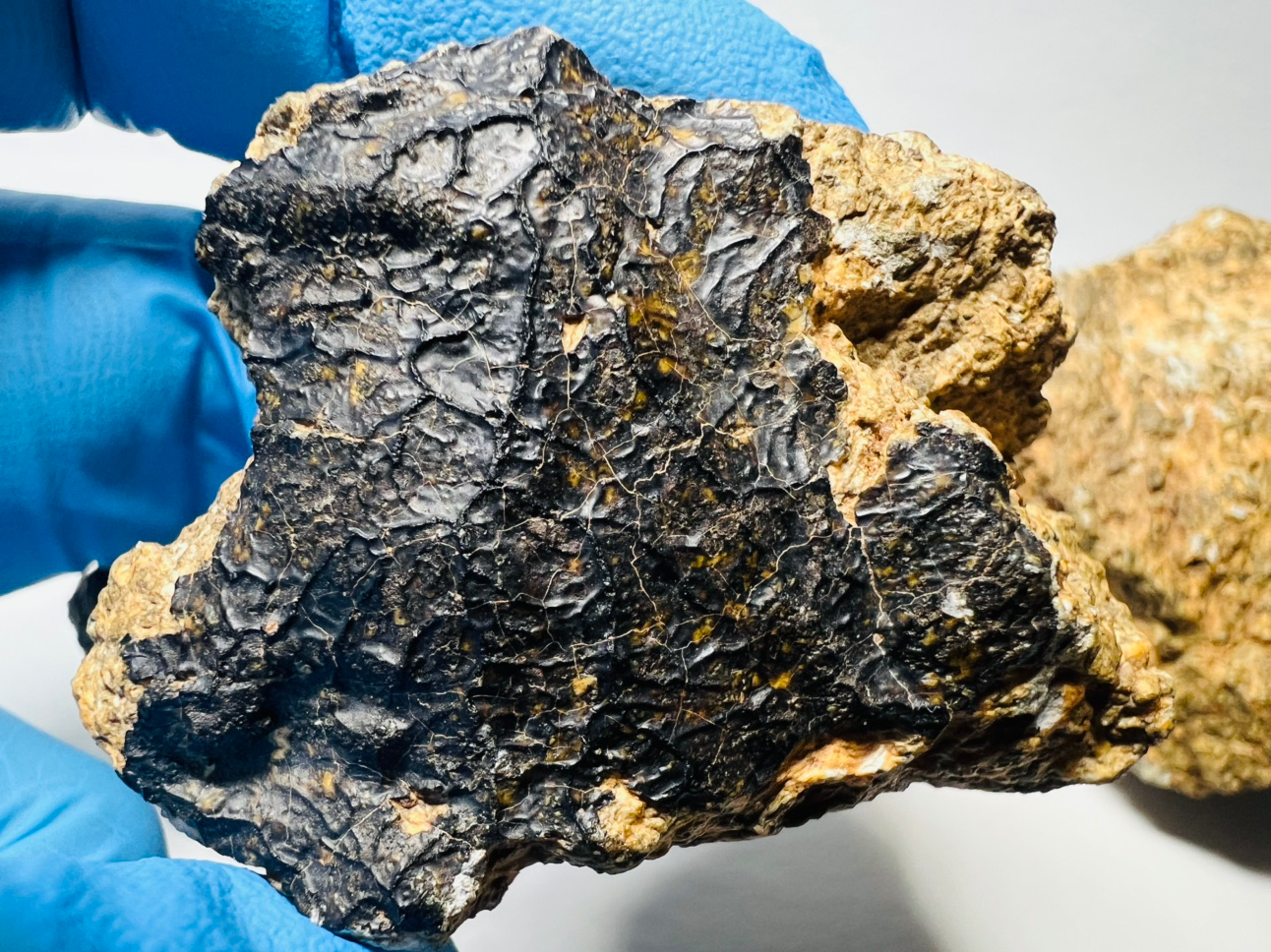 용융각 이라는 표면입니다. 소행성이 지구의 대기권을 통과할 때, 대부분 타서 소멸되지만, 모두 소멸되지 않고 지구의 지표면에 떨어진 것을 운석 이라 부릅니다. 까만 표면은 우주에서 지구로 들어왔다는 대표적인 증거 입니다. Fusion Crust