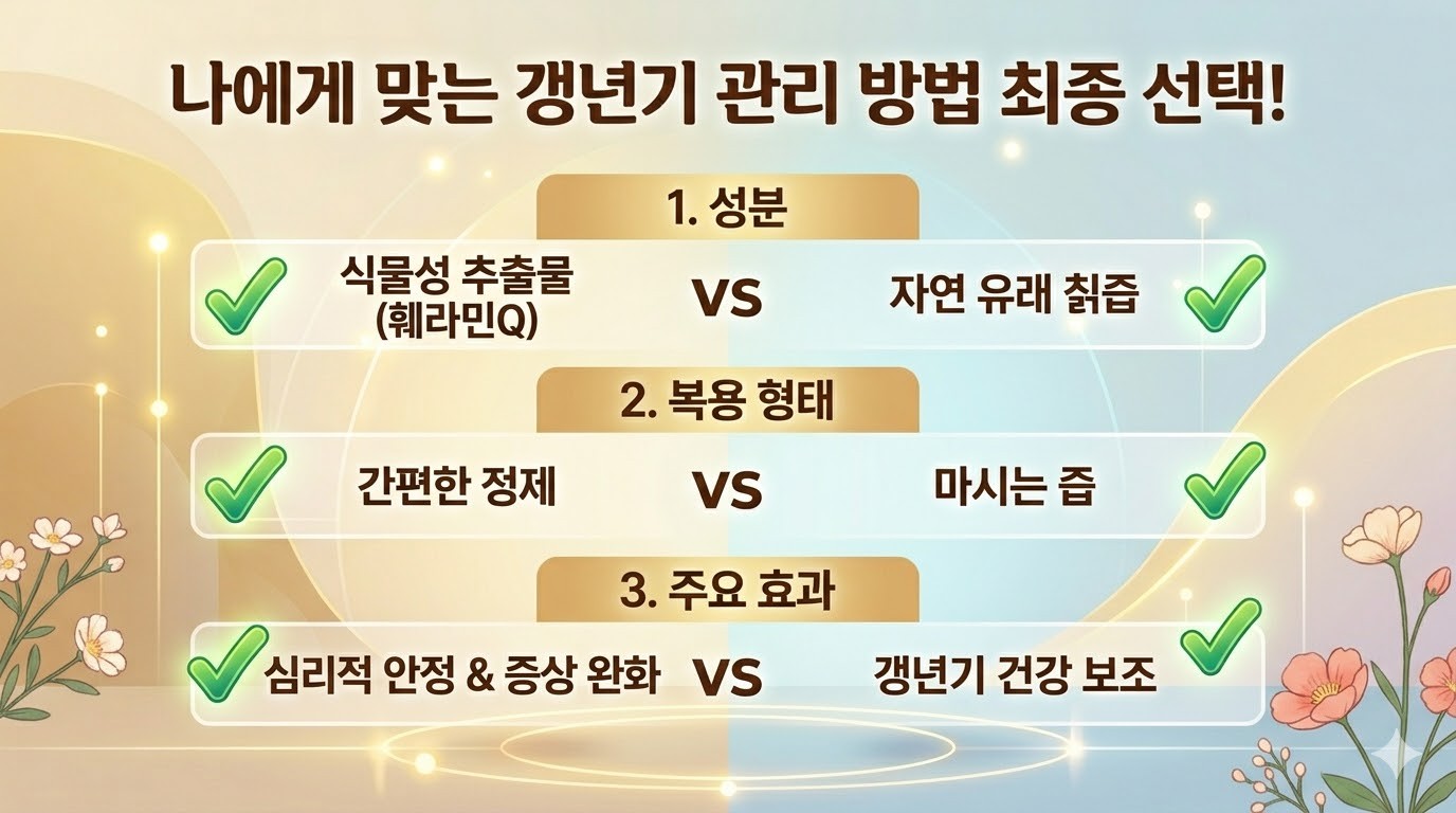 갱년기 증상 완화를 위해 훼라민Q와 칡즙 중 고민이라면 본인의 증상 강도에 맞춰 선택하세요.
